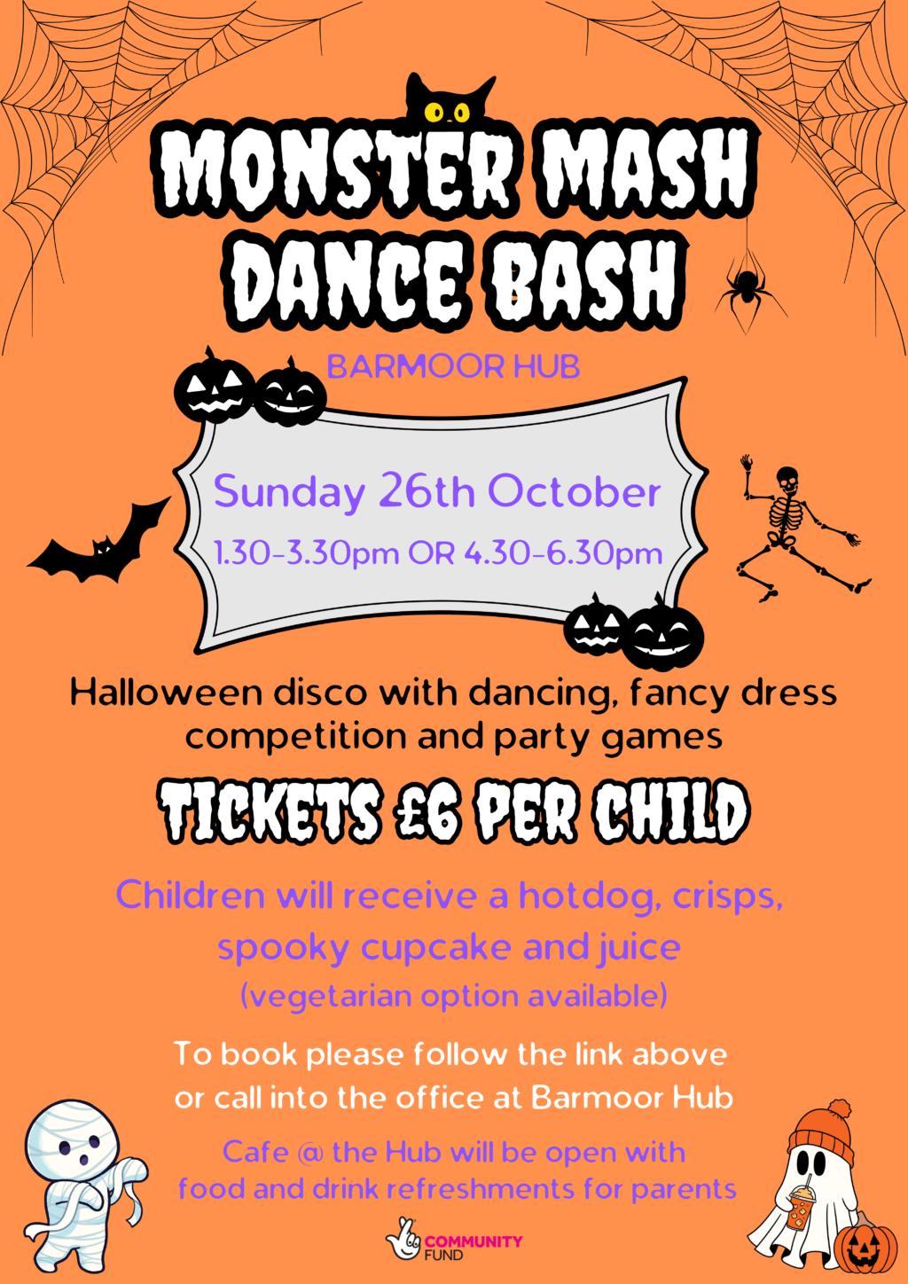 Children’s Halloween disco with fancy dress competition, dancing and party games.